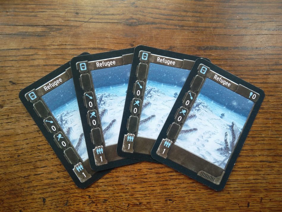 If you step back to look at the thematic context of your actions, it’s horrific. You’re casting out families, children and the elderly from your tribe. It could be said the game is a little blasé in the way it encourages players to treat refugees. Though, this ruthless disregard for human life fits the theme perfectly; think of any post-apocalyptic fiction and you’ll usually find a scene in which people argue about the value of people vs the value of the group. It’s also the usually the villains that make the decision to abandon the weak, so think about that the next time you “make your deck more efficient”.