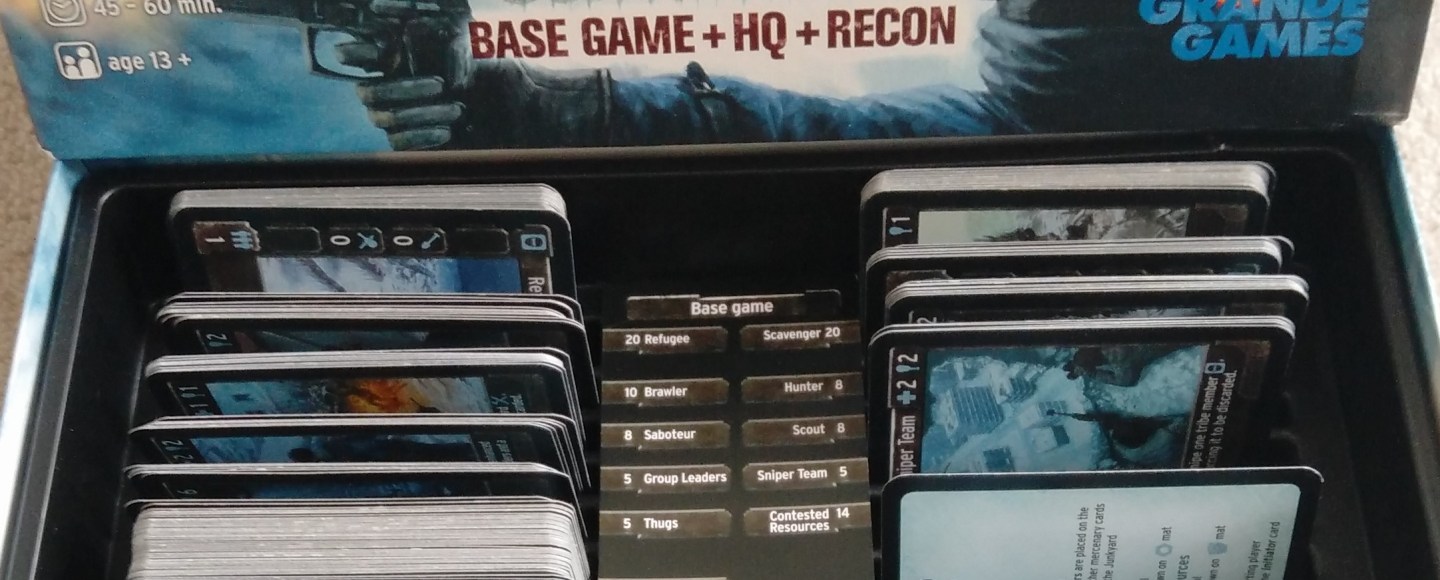 Perhaps the most thematic mechanic, and my favourite part of the game, is the junk pile: a deck of tools and medicine mixed together with a lot of useless junk. Junk cards literally have no game value and, as the useful item cards are removed, you have to dig (draw) though more and more of the stuff in order to find anything worth using. None of the cards you’ll scavenge from the junk pile are particularly exciting but they are necessary. Medicine and tools are essential for survival. You won’t get anything flashy but you’ll find enough to keep going. Without medicine, your tribe (engine) will fail. Without medicine why would the toughest mercenaries ever consider helping you against your enemies?
