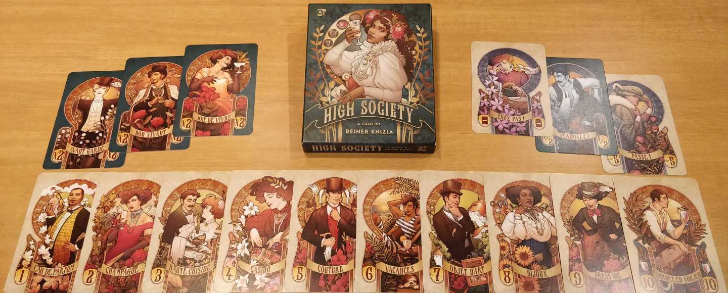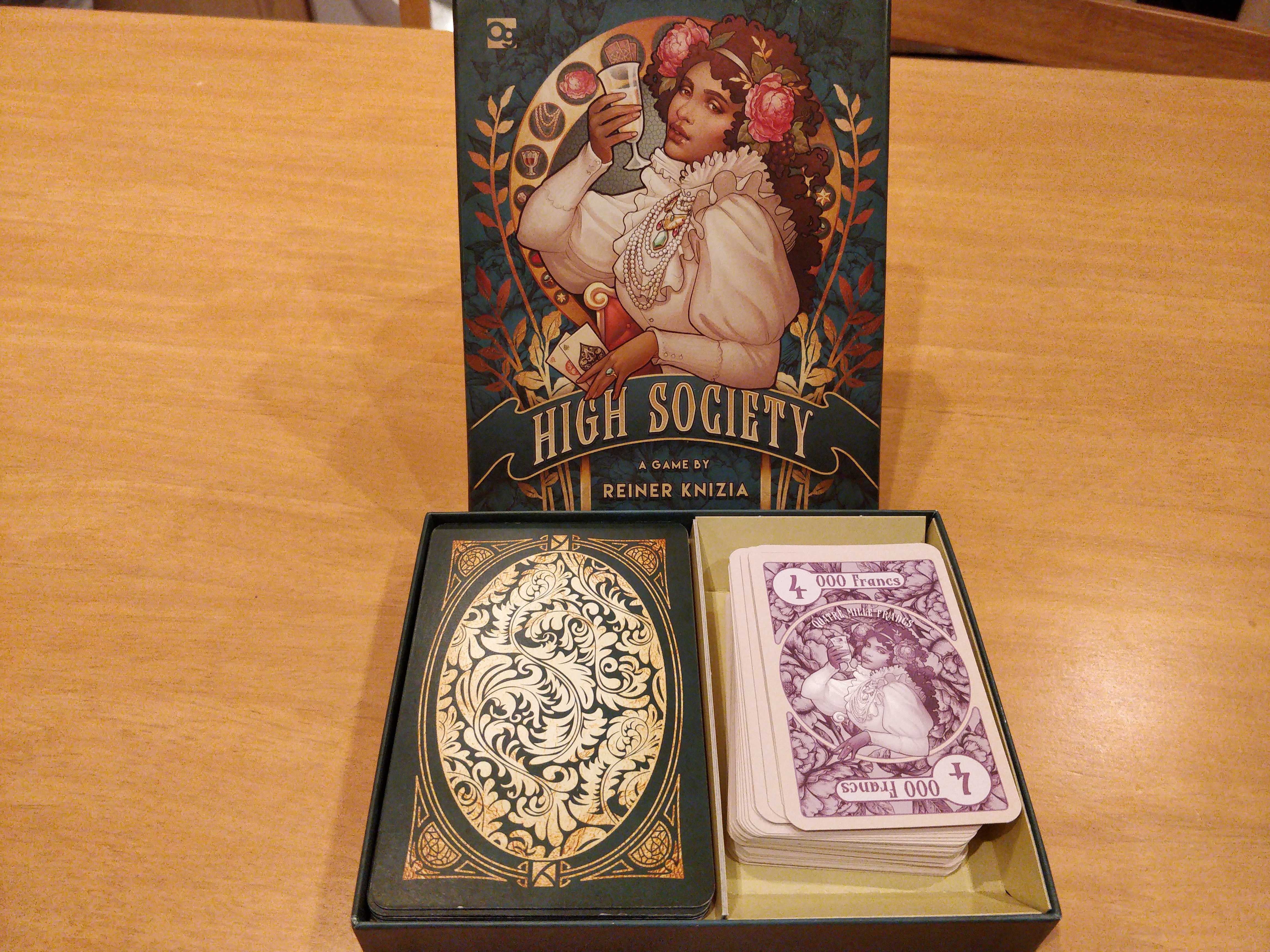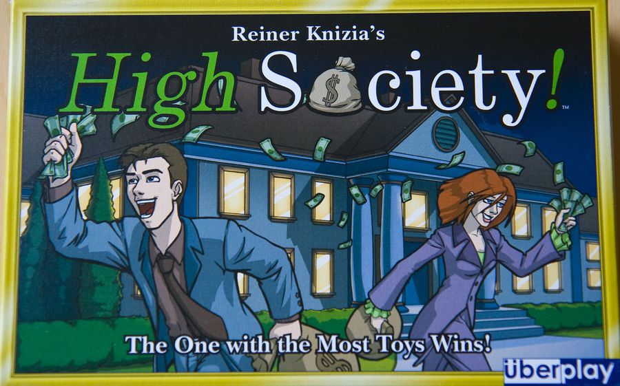 High Society is an auction game in which players spend their hard-inherited wealth on luxuries to achieve the highest score at the end of the game. The one caveat being that before anyone gets to score, the poorest player (least money remaining in hand) immediately loses. For a game first published in 1995, High Society holds up and provides just as much bite as many other popular small box games.