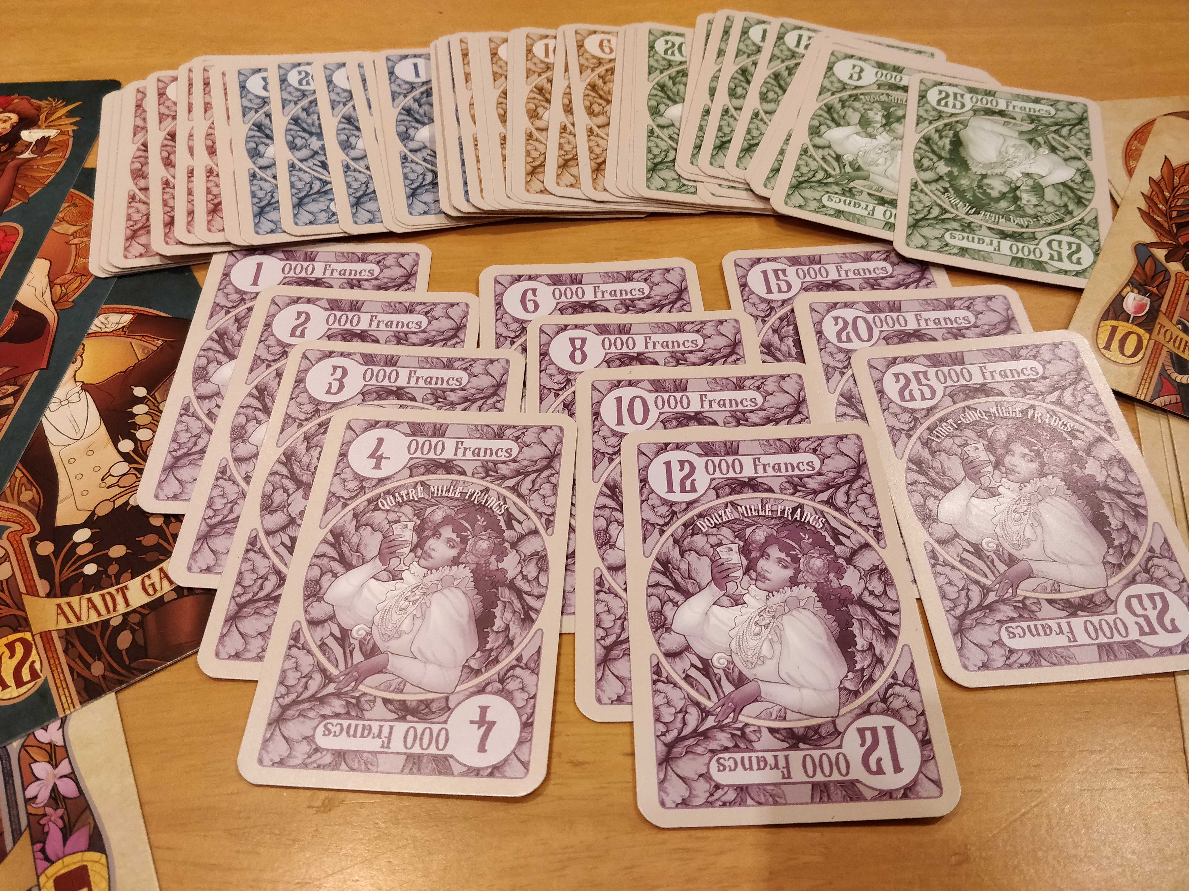 What’s more, it’s not just a case of how much money you have left but also how that reamining dosh is split between your cards. If you have 25,000 Francs remaining but it’s contained on one card, you can’t bid as you’ll knock yourself out of the game. Keeping back lower denominations for later rounds allows you to make canny bids raising in small increments instead of realising that if you want to raise, the smallest card you can play is 10,000 Francs. The rule that eliminates the poorest player creates a palpable tension, especially as you go into the final few turns. In several games we’ve counted players out because they were a little to frivolous in splashing the cash early on, only to reach the last few rounds and realising you’re not so flush yourself – “How much can I spend? I really need this Champagne but I think Layla still has 15,000 Francs”