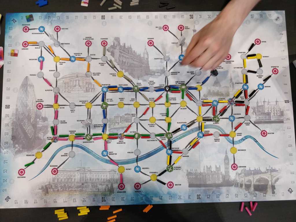 For such a friendly looking game with its bright watercolour style, On The Underground proved itself surprisingly ‘thinky’. Each turn the passenger will travel to a new location determined from four random cards, depending on which is the easiest to get to (least walking & fewest tube connections). When the passenger reaches a location a new card is drawn to replace it. To succeed, you must figure out where the passenger is going and how you can alter his route by laying new track. Figuring out where the passenger is potentially going is a simple puzzle until you factor in all the variables that you have the power to change. Is it best to build an efficient network of tube lines in the hope of scoring lots of points later? Should you take a more tactical approach, laying new track whenever you can to score a point or two each turn? With additional ways to score such as completing loops, connecting certain locations, and building lines to major train stations, On The Underground’s puzzle is a moreish one that balances planning ahead with being flexible enough to respond to the changing board. With so much to consider, turns can take a while and downtime may be an issue when playing with 3 or 4 players.