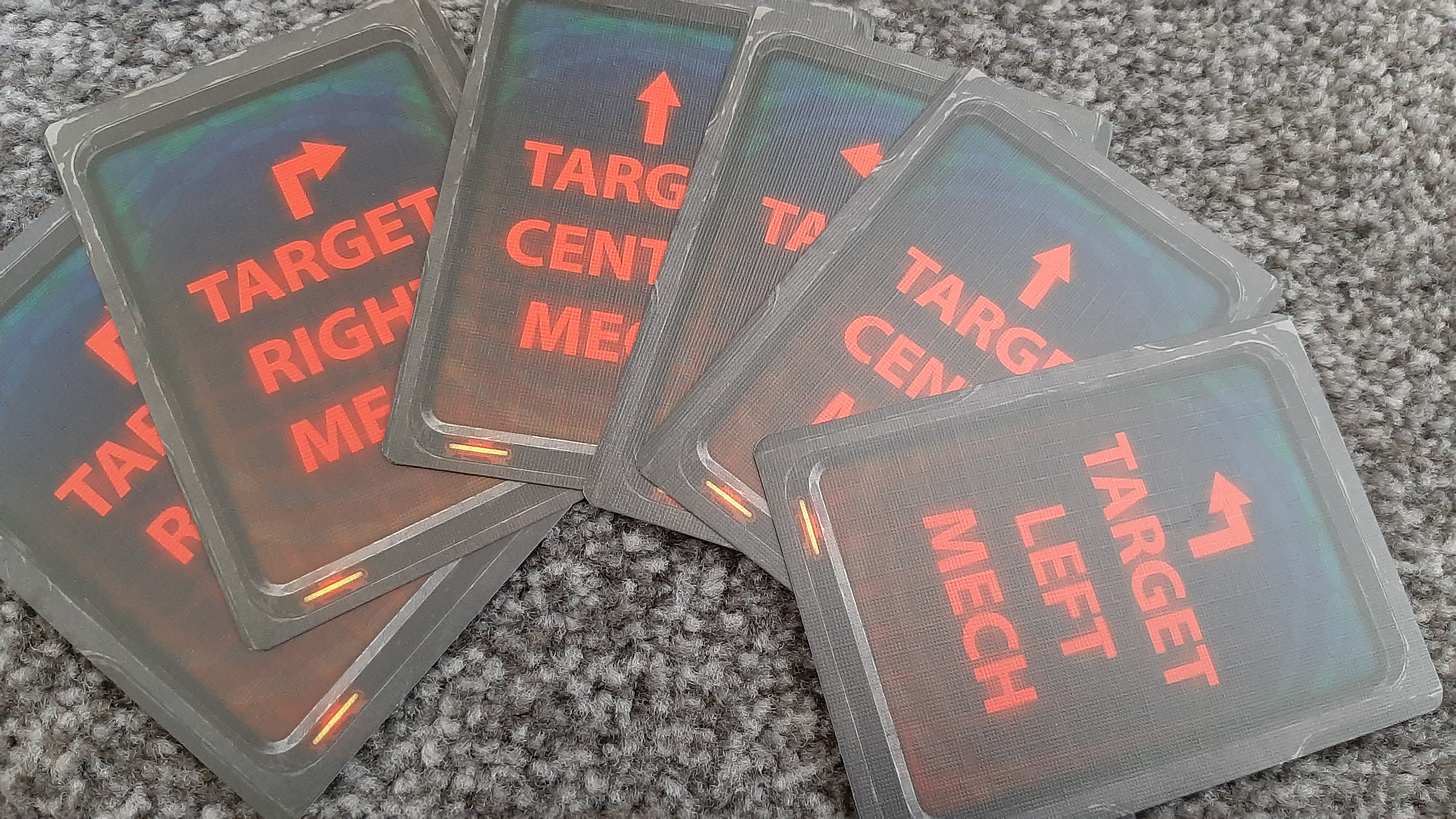 You are given a bespoke deck of cards and player board for your mech. Players are going to simultaneously choose a card to play and then reveal at the same time. This might be a heavy laser fire, an electron beam, an evade or perhaps an activation. Once you have both chosen and revealed, the fastest card goes first with higher numbers being faster. However, a lightning bolt symbol with also goes first. And going first is important because if you attack faster than your opponent then you will disrupt them, meaning they don’t get to use their card.