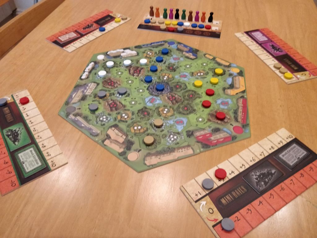 Mini Rails dangles this puzzle before you a game of straightforward choices and completely open information made complete chaos by one simple factor, you don’t know what the other players will do. Finishing Mini Rails for the first time, I was impressed by the amount of tension it was able to wring out of simple choices. Cleary there must be a strategy to figure out. A way to crack the game and become a savvy stock trader. So far, however, I am no closer to a winning strategy but I am beginning to appreciate the chaos within which you must make your decisions. The earlier your take your turns in the round the more choice you have from the market track but then more players are going after you. Their actions can be difficult to predict and they will affect the outcome of your earlier decision. Going later in the round leaves you fewer choices of stocks to take or tracks to place but you can be more certain of how the rest of the round will affect your portfolio.
