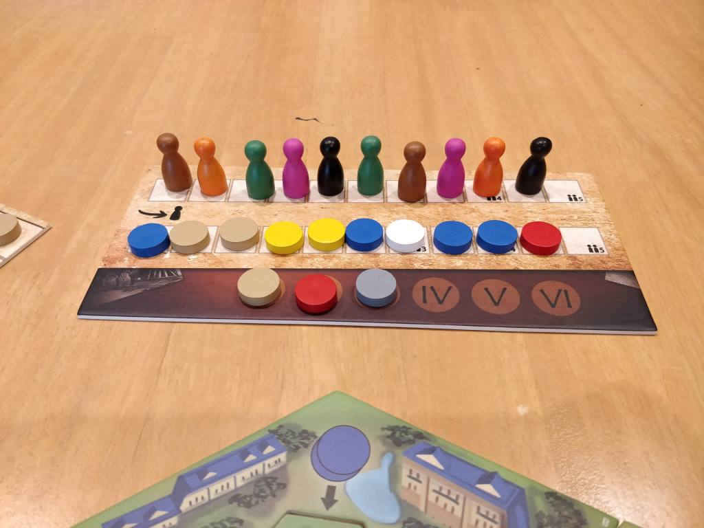 The game is played over six rounds and each round you’ll have two opportunities to take a token from the market. One you’ll add to your stock board as a stock in that colour, the other you add to the board representing a new section of track. By the end of each round after the players have taken their actions, a single token will remain in the market representing a company that is paying their taxes.