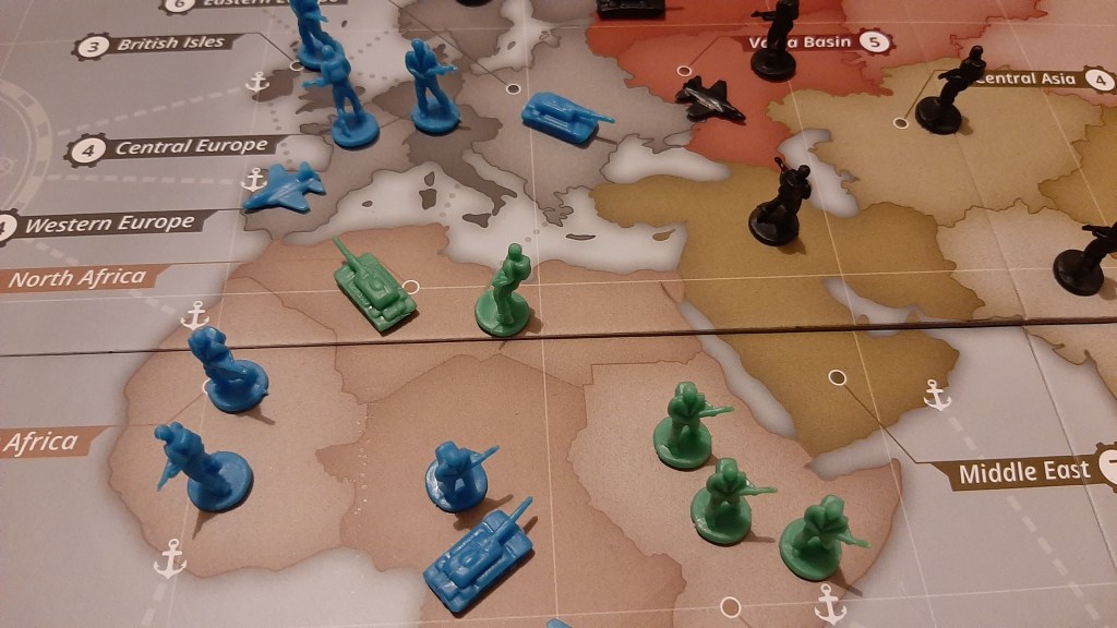 Once again to compare it Risk, being able to collect troops one turn (returning them to your player board) and drop them in another location the next sounds like a really good idea. It means that slowly moving troops across the board is eliminated, reducing a lot of the length of a regular game of Risk. However, it also removes any consequence of placing your troops. You can zip them in an out of continents on a whim and place them elsewhere and means that troop placement is again not an interesting decision.