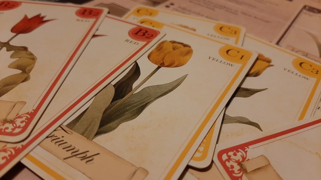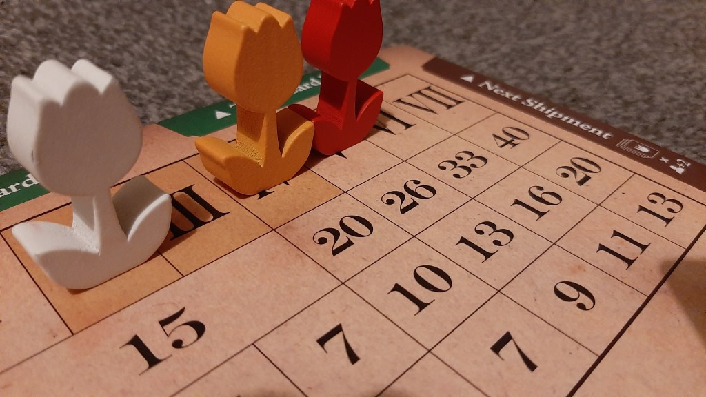 Alternatively, you can force players to bankrupt themselves. That’s right, Tulip Bubble might be a game about flowers but it isn’t for the soft-hearted. Buying and selling tulips is tricky, the market might go up or down each round meaning, those red flowers you bought might sell for less than you bought them for last round. However, the alternative might be true. For example, if Emily just gets that last red flower she can sell to a collector. To sell to a collector she first needs to pay off the finance on her various tulips, buy that last one to complete her set and hope that she doesn’t get into a bidding war with one of the other players. Unfortunately, Nevi (that’s me) has spotted that she needs that last flower. So he decides to start an auction for that little red flower. Emily knows exactly how much she can spend on this flower to be able to pay off her financing is only around 15 guilders, which means anything more than that and she might make a little in the process but won’t have enough to make any real cash this round. The bidding goes back and forth and, unfortunately for Emily she has miscounted, she needed 17 guiders to pay off her finance. So while she has won the auction, she can’t sell to the vendor this turn and has instead left herself with basically no money. This means she either needs to sell some flowers off at a loss or, no there is no or in this example. She needs to sell flowers at a loss and then slowly rebuild her tulip empire.