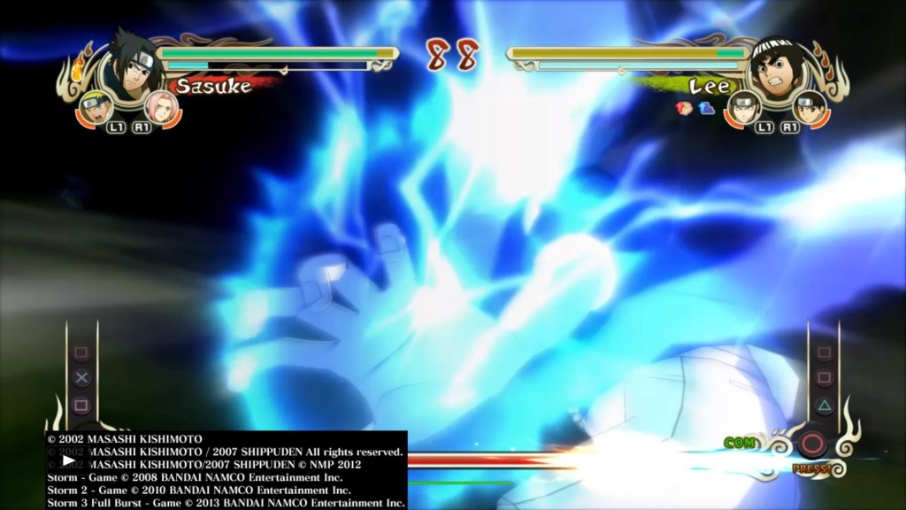 The second bit of admin is to briefly explain that these are 3D fighting games. In most instances, players will be duelling an opponent 1-on-1, to reduce their health bar to zero. There are examples of mini-games and giant boss fights but the majority of the game is a punch up between two characters. Players can input a series of one button punches and kicks that while it has some nuance is still a one-button combo system. Where things get more interesting, or at least more spectacular, are with the special powers. Each character has a selection of their moves from the anime/manga that they can pull off one their chakra gauge is high enough. This might be a Chidori for Sasuke or a Rasengan for Naruto. Players can freely move in three dimensions but you can also lock on to an opponent to bring the fight into a 2D plane. I’ll explain further as needed but basically, remember this is a 3D fighter.