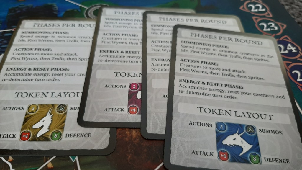 And that is roughly the rules. Each creature has a set number of actions from moving to attacking and players take turns in the order of lowest to highest energy. Once you hit a certain point on the energy track you’ll start to lose energy each turn, and this again means that players who are at the back have a chance of catching up and winning the game. And overall I’ve enjoyed my games of Summoner’s Isle. It’s quick, the board is tight forcing frequent fights and has enough strategy in terms of blocking, creature placement and movement to be a fun little puzzle.