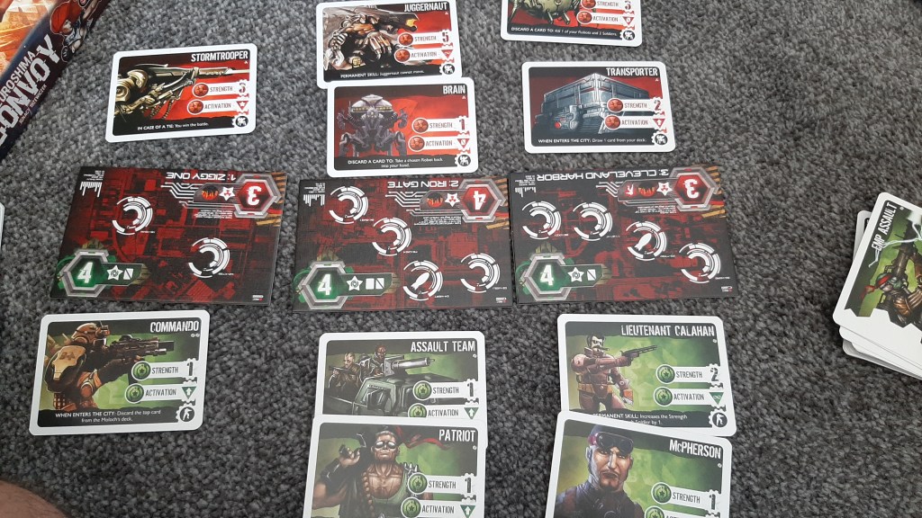 The game is set up with different district boards and the Moloch player is trying to get from the start to the end so that they can win. The Outpost player is trying to make the Moloch player burn through their deck before they reach New York. On each player’s turn, they can play as many cards as they want in any of the districts on the board and once both players have done so there is a battle. You add up the strength of each side and the higher one is the winner. If it is the Outpost then they get to discard cards off the top of the Moloch players deck, and if they lose then Moloch blows up that area and moves onto the next. When Moloch wins they also get to kill off a few pesky soldiers on their way as well. Play continues like this until one side is the winner.