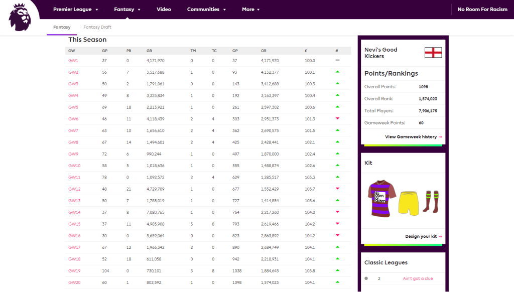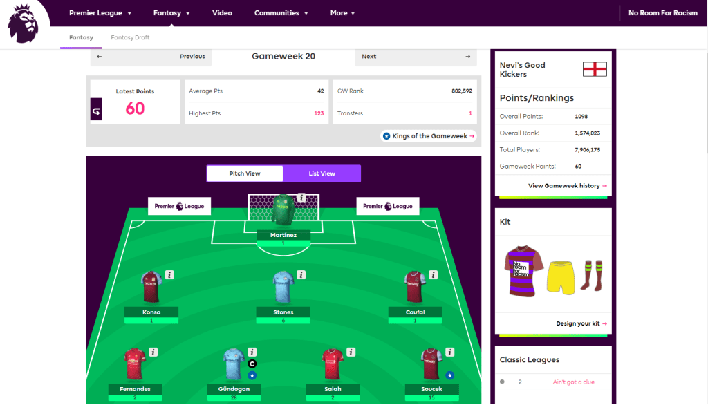 Week 21?! How did we manage to get this far into the future from my last article on Fantasy Premier League way back in September 2020? While it doesn’t feel like 20 gameweeks have gone since then, at the same time it weirdly feels like I’ve been a football fan for years now. In those few months, there have been highs and lows, triumph and failure, and I’ve enjoyed every moment. So what’s happened to this human male who proclaimed zero interest in football for 30 years, only to become obsessed with FPL?