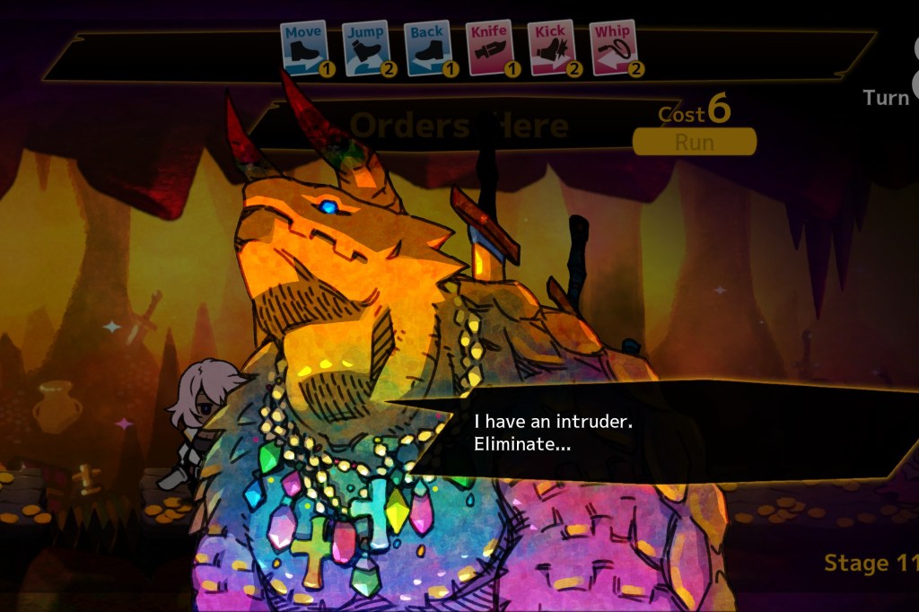 I’m not totally without criticism here, especially for the user interface. With the game’s strict nature, if you make one error the stage attempt is basically over. However, I couldn’t find any pause menu by hitting any of the standard buttons, or find a way to restart without finding a way to die. I was playing on my laptop, which has a 3:2 aspect ratio on the screen, and while most things worked as they should, some bits were cut off at the edges, such as the turn counter. This is a bit of a specific case with an unusually square monitor, but worth considering. It didn’t impact my play too much, but would be nice to fix. The game launches in Japanese as well, and you need to find the (labeled) language menu. Speaking of language, the translation is a little awkward, but not without its charm. Given how often it is that I see games like this on Steam with no translation whatsoever, it’s nice to have one at all, and I won’t complain too much about it.