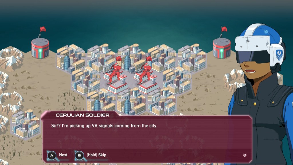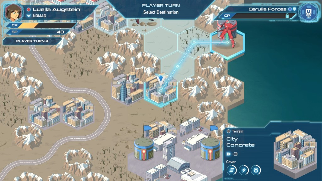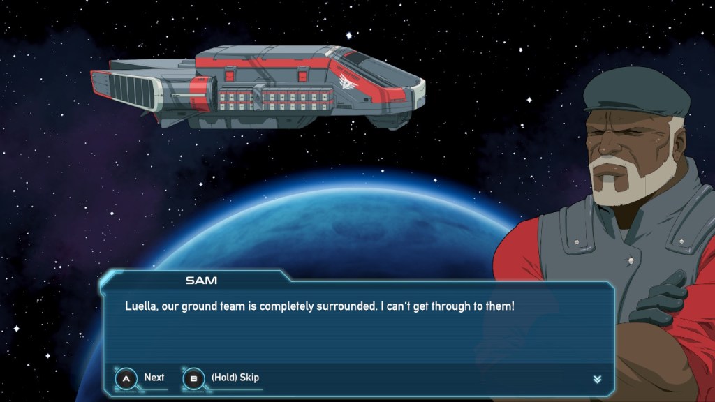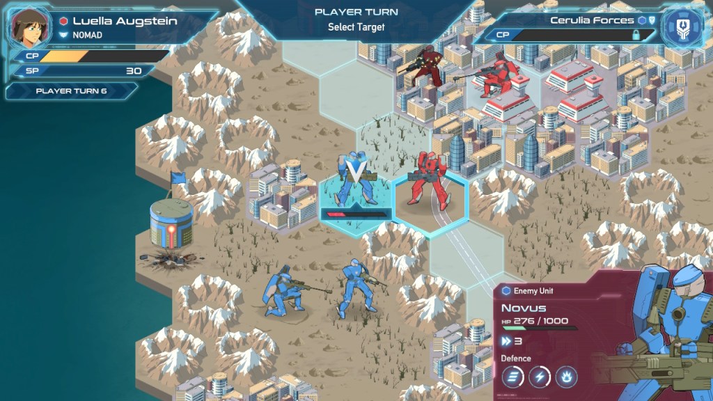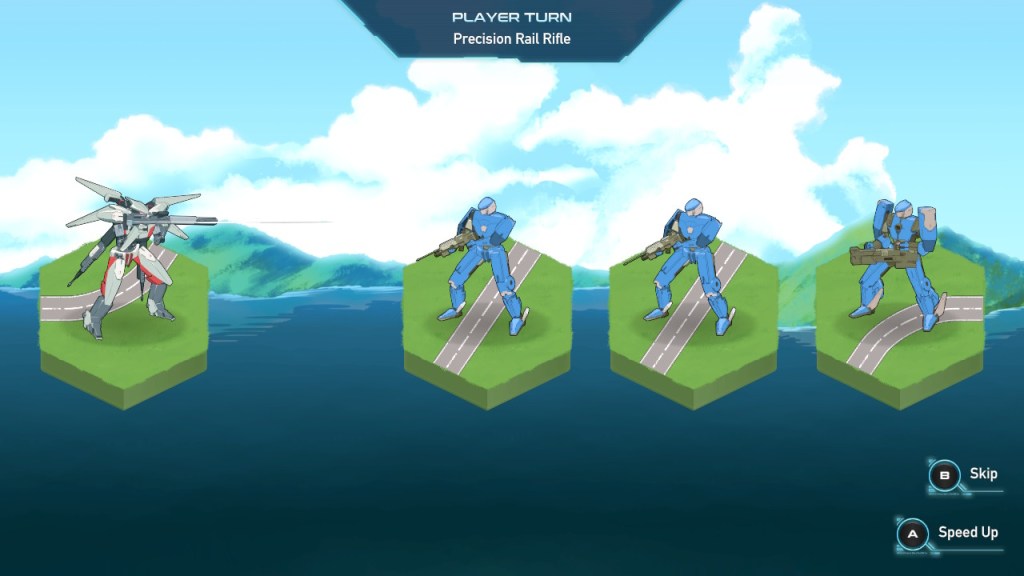 My second issue is the visuals. This might not bother you, or you might like it, but I found the art style didn’t help me enjoy the game. While it’s harkening back to shows like classic Gundam, it apes it with this flat emotionless style. While character cut-outs in dialogue show different faces, in battle there is a single person you can identify and the waves and waves of faceless nobodies. And the mech designs might as well be people in armour. Only the special mech for your commander (the person whose story you’re following), looks remotely distinct. Nothing else has any flair or personality, which is such a shame considering Gundam has iconic designs like the Zaku. This isn’t helped by the fact that when an attack happens you are moved off the battlefield for a Fire Emblem/Advance Wars style animation. I’ve never been a fan of these, so turned it off promptly, but it only served to make this game even more of a slog.
