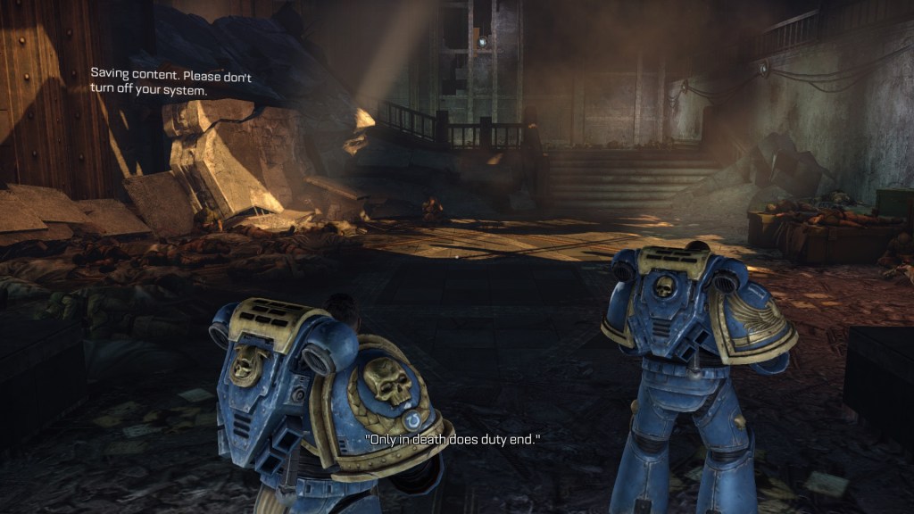 I have a bit of a habit of revisiting things with a critical eye, so I worry I’ve been a bit unfair on Space Marine, a game I genuinely like, here. In fact, it’s an interesting artifact of this game’s form-factor, I think. These games, about the length of two movies and running entirely on big-explosion set-pieces, have a habit of just enjoyably sliding past the eyes. The gameplay is genuinely solid – and scales well with difficulty, which is nice – with a good mixture of target-selecting ranged shootygunsand melee combat. The setting of the game is mostly still impressive and it’s graphically not aged too badly, as long as you don’t look too close. Like many things in 40K, it feels like a relic of a bygone age, but not really in a bad way. Though I wish that this wasn’t the case, that the last decade had been kinder to 40K games, Space Marine remains steadfast as one of the most memorable games in the setting.