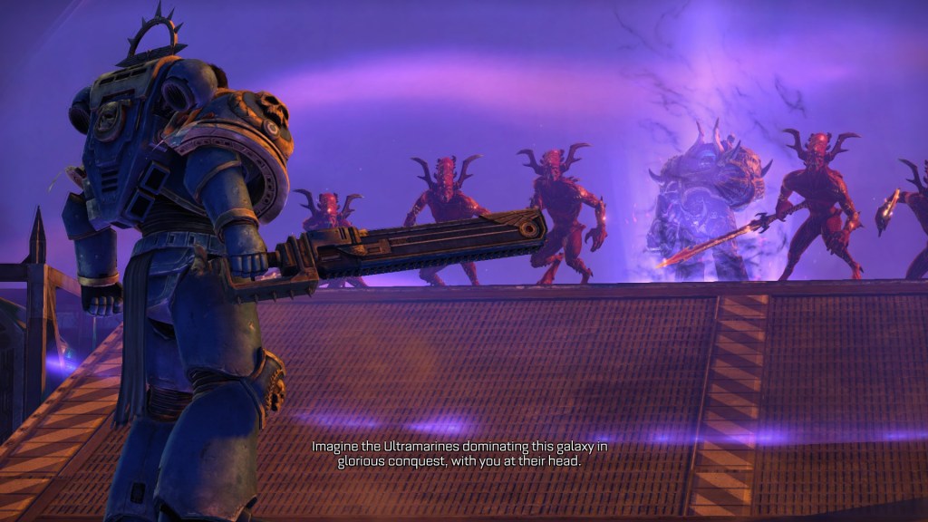 Speaking of Titus himself, people really love this guy. I think he’s sort of the classic ‘protagonist Space Marine’ of the sort you see in a lot of 40K material. By that I mean he doesn’t hew too closely to the Imperium’s bureaucratic rules (plot-relevant), has a distinct human side, and lacks that sort of helmeted transhuman inscrutability that other stuff will often lean into. In this way, he reminds me of other centre-stage Space Marines who get given a more empathetic view for the benefit of the audience, like the Horus Heresy’s Garviel Loken. He’s flanked by a limited secondary cast, mostly just grizzled-veteran Sidonus and rulebound rookie Leandros, who’s always there to bother Titus when he strays from the official policies of Space Marinery. The voice cast is still notably solid, with Mark Strong’s turn as the very-shiny cool-dude Titus sounding about as heroic as ever a Space Marine has.